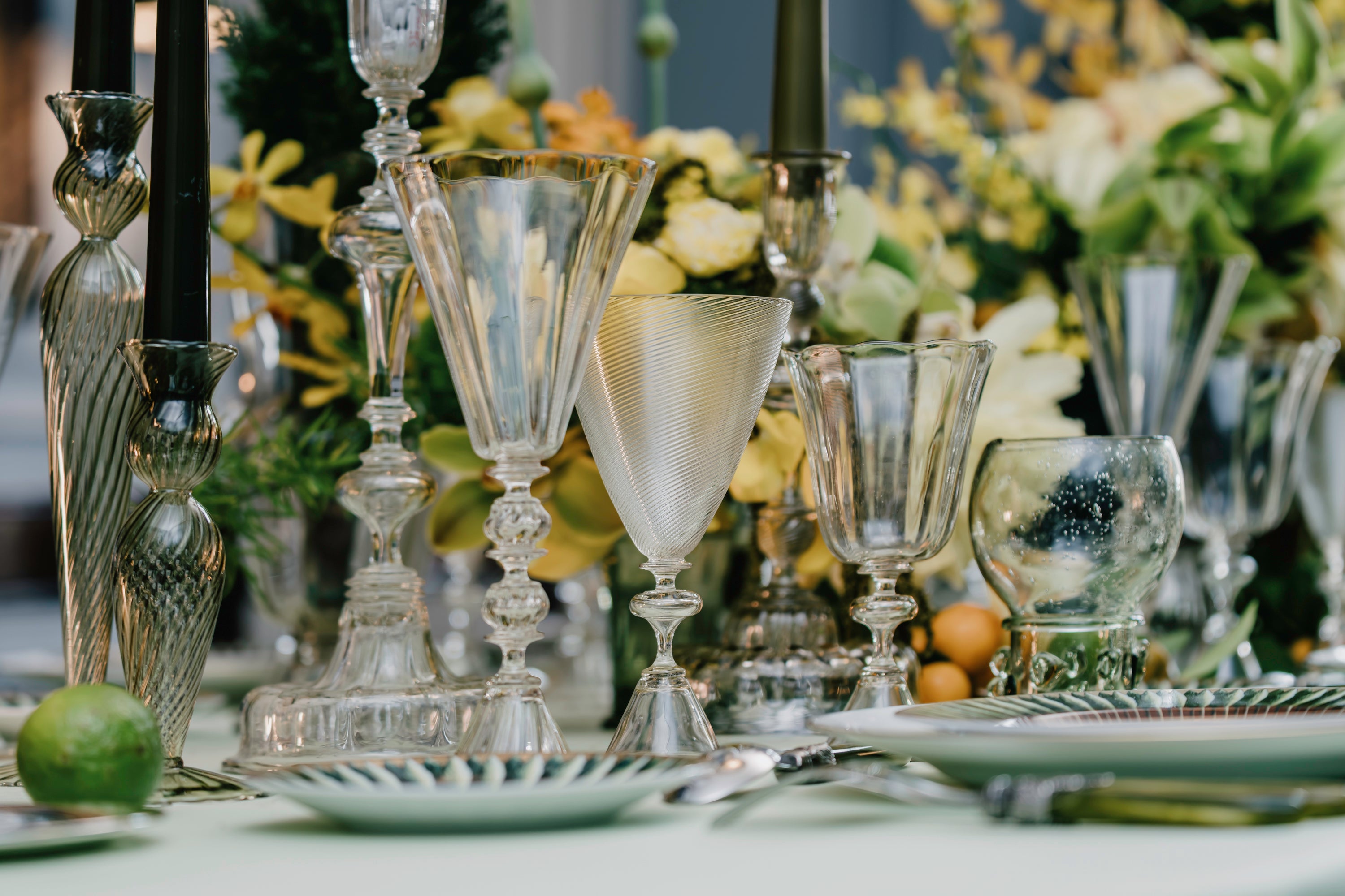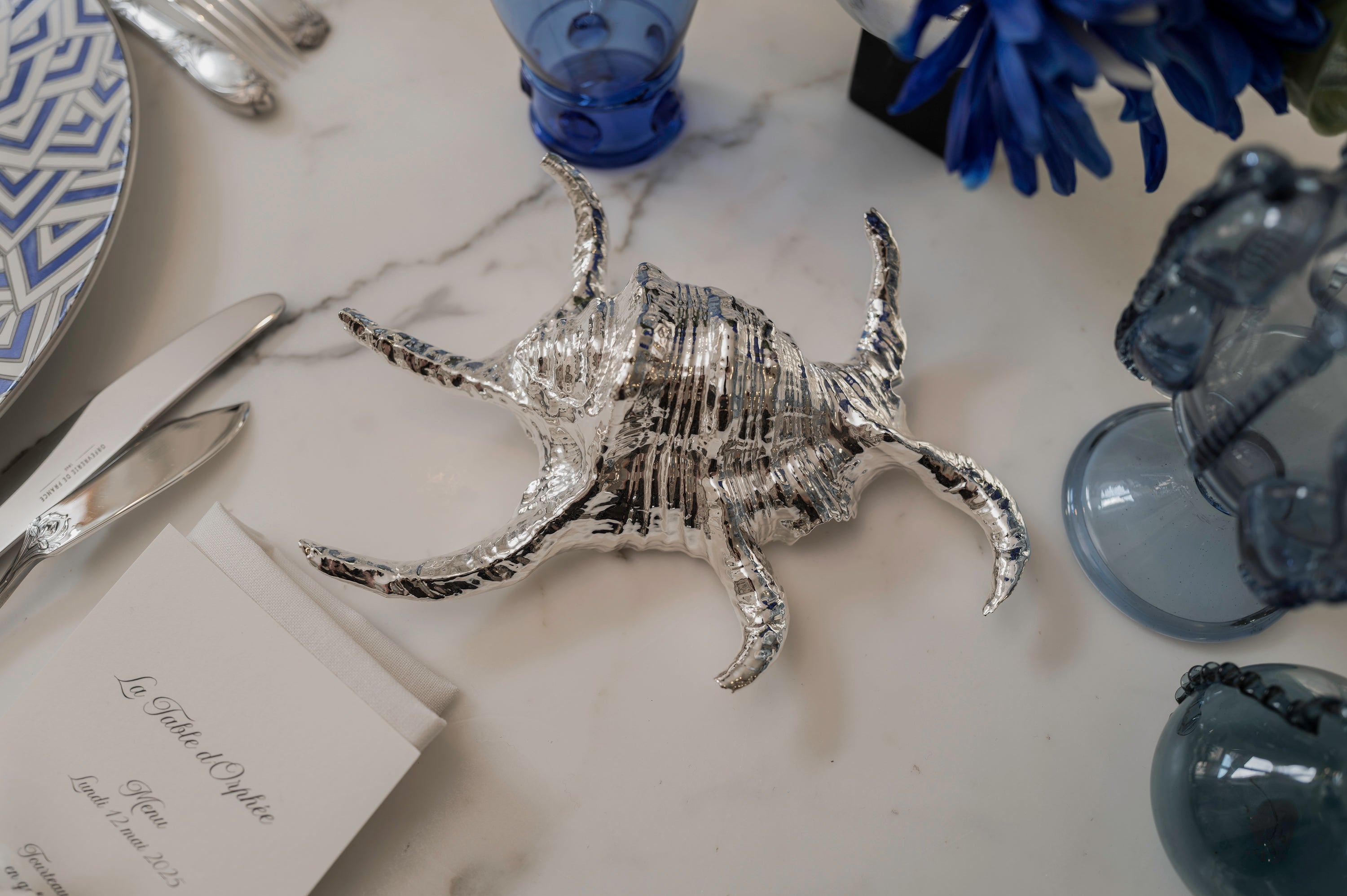 Cerclés dans leur cage d’or, les tangaras du Canada et les perroquets Nestor s’envolent par le rêve en des orchidées chimériques, prêtes à nous mordre comme le tigre du Bengale. Partout alors se tisse une jungle de cette rue de Paris, où la pluie fleurdelisée en mousson embaume la table. Du prince, il n’en reste que des souvenirs gravés dans ses assiettes, tissés dans ces serviettes. Et sa fleur favorite, rare et précieuse, transformée, endormie, l’orchidée en orfèvrerie, vient parer cette volière de ses mutations secrètes.